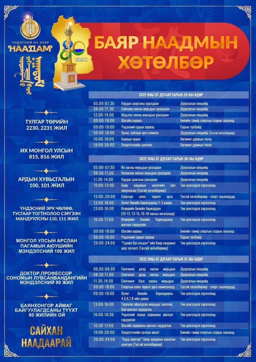 Баянхонгор аймгийн баяр наадам долдугаар сарын 29-ний өдөр Хурдан азарганы уралдаанаар эхлэх бөгөөд уламжлалт сурын харваа, хүчит бөхийн барилдаанаар үргэлжилнэ. Харин долдугаар сарын 30-ны өдөр баяр наадам үргэлжлэхийн сацуу Баянхонгор аймгийн "Гурван бүс" нэгдлийн уран бүтээлчдийн бүрэн хэмжээний шоу тоглолт болох бол долдугаар сарын 31-ний өдөр Сонгомол дээд насны морьдын уралдаан, спортын олон төрөлт арга хэмжээнүүд, хүндэтгэлийн хүлээн авалт болох юм.