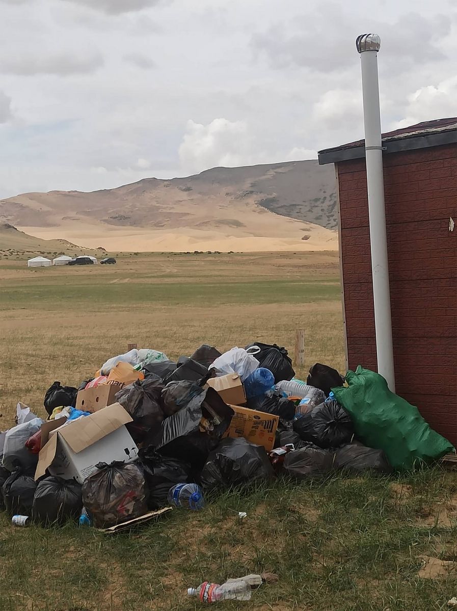 Хүмүүс ууттай хогоо гарах хэсгийн ганц жорлонг бараадуулж орхих гэхээр үүдний хэсэгт мөнгө хурааж буй ажилчид “Хог энд хаяулахгүй. Хогийн цэг байхгүй. Наад хогоо Хогийн цэгтэй газар хая” гэсэн шаардлага тавих. Хогийн цэг нь хаана вэ гэж асуухаар өөдөөс “Хамгийн ойрхон хогийн цэг Яруу суманд байгаа” гэх. Эндээс хэр хол вэ гэхэд “Сайн мэдэхгүй ээ, Хорь, гучин километр байх” хэмээх. Элс, чулуу ихтэй, зам муутай газар зөвхөн хог хаяхын төлөө тийшээ явна гэдэг аялагчдын хувьд бухимдахаас өөр аргагүй. Зарим нь ч дуулгавартай гэгч нь хогоо аваад явж харагдах.