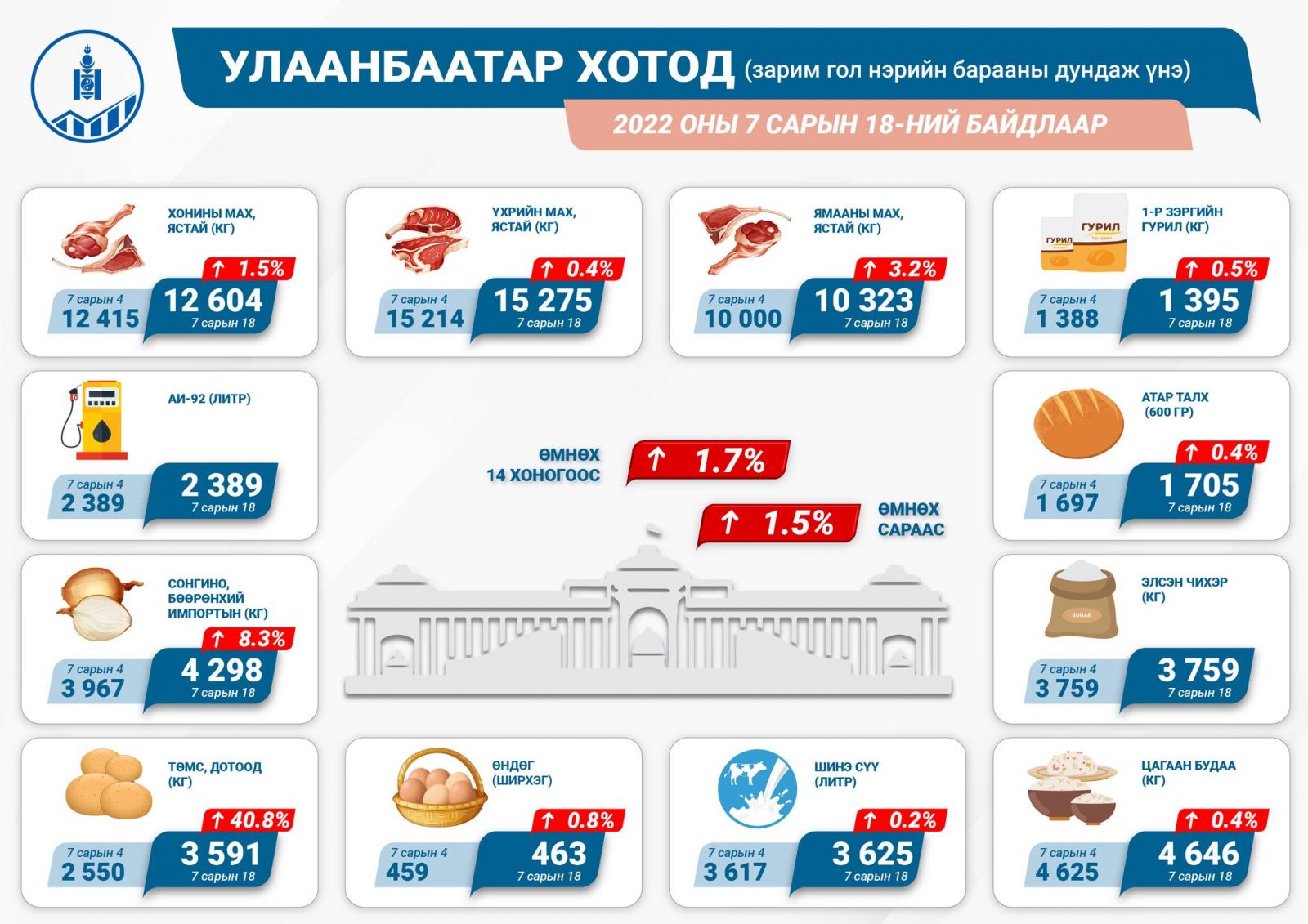 2022 оны долдугаар сарын 18-ний байдлаар хүнсний гол нэрийн барааны үнэ өмнөх сараас 1.5 хувь, долдугаар сарын 4-нөөс 1.7 хувиар тус тус өссөн байна. Тухайлбал хонины ястай мах кг нь 12415 төгрөг байсан бол 18-ны байдлаар 12604 төгрөг, ямааны мах 10 мянгаас 10323 төгрөг, Атар талх 1705 төгрөг, импортын бөөрөнхий сонгино 3967-оос 4298 төгрөг, дотоодын төмс 2550 төгрөгөөс 3561 төгрөг болж тус тус нэмэгджээ. Эдгээрээс хамгийн өндөр үзүүлэлтийг дотоодын төмсний үнийн өсөлт эзэлсэн байна. Төмсний үнэ өнгөрөгч сараас 8.3 хувиар өсжээ.