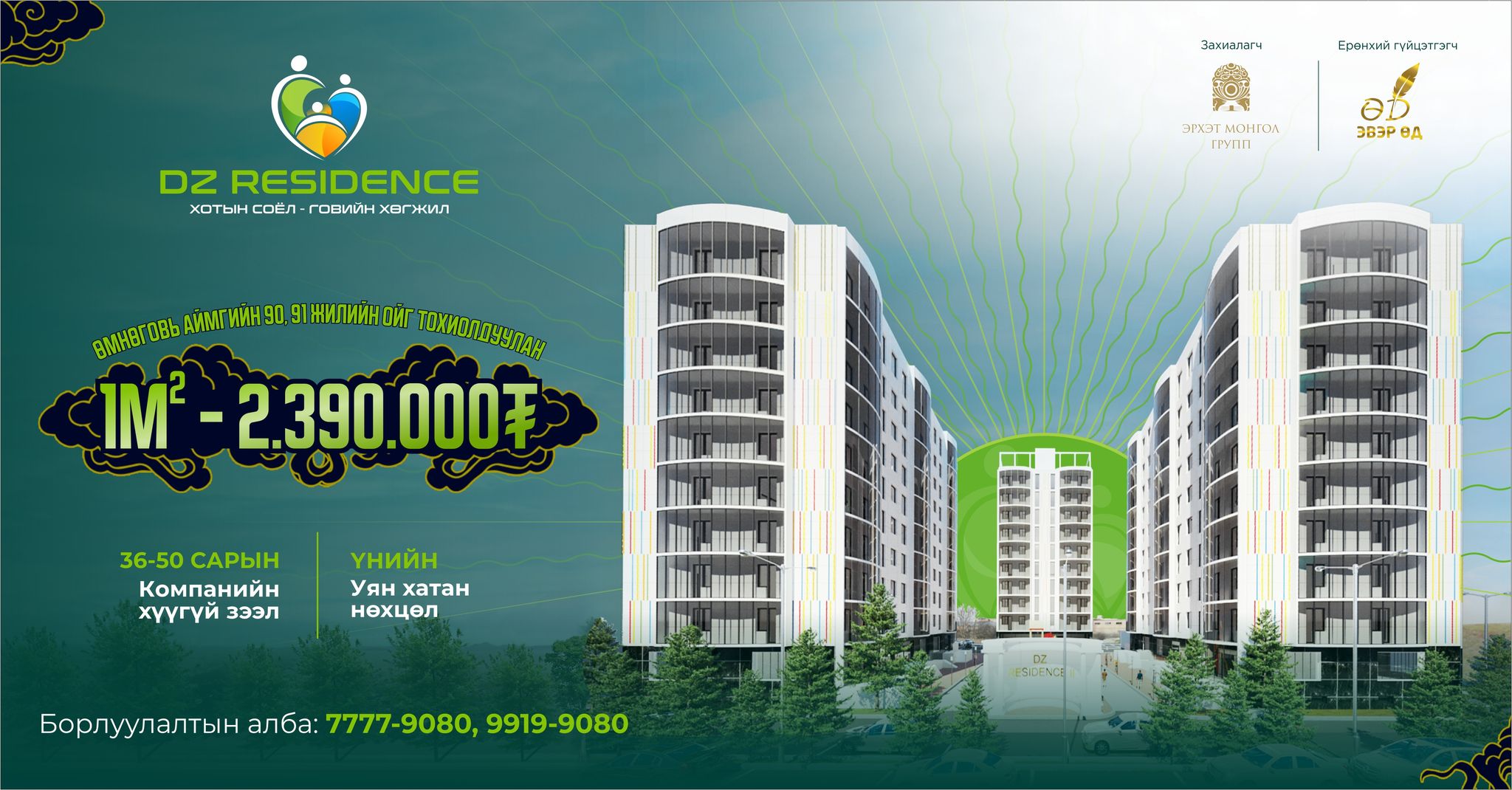 “Эрхэт Монгол” групп, "Эвэр өд" ХХК хамтран Өмнөговь аймгийн Даланзадгад хотын шинэ суурьшлын бүсэд "DZ Residence" өндөр чанартай, бүрэн цутгамал орон сууцны 1-р ээлжийн 163 айлын 2 блок барилгын бүтээн байгуулалтай эхлүүлэн, маш амжилттай үргэлжлүүлж байна.