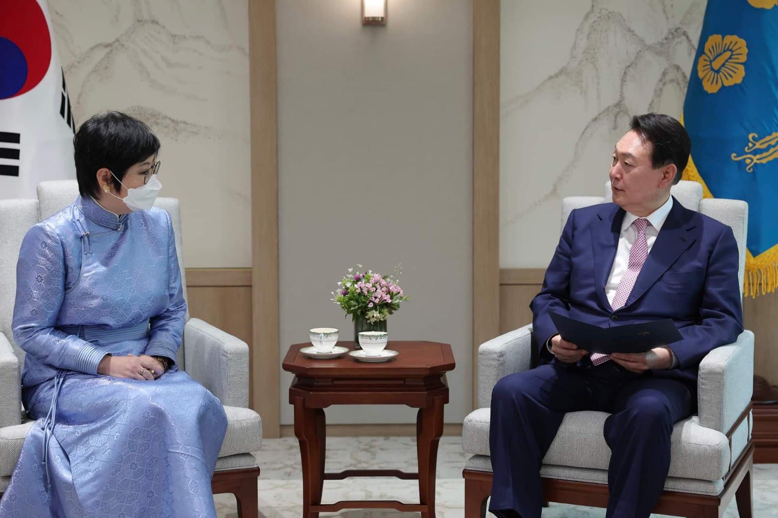 Итгэмжлэх жуух бичиг барьсны дараа Ерөнхийлөгч Юн Сог Ёл Элчин сайд Э.Сарантогосыг хүлээн авч уулзан, үүрэгт ажилдаа орсонтой нь холбогдуулан баяр хүргэж, ажлын өндөр амжилт хүсэв.
