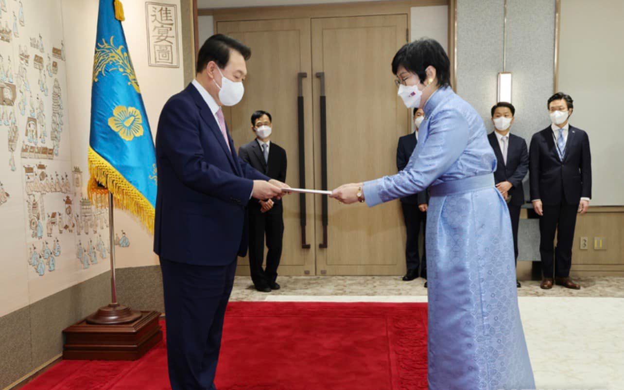 Монгол Улсаас Бүгд Найрамдах Солонгос Улсад суугаа Онц бөгөөд Бүрэн эрхт Элчин сайд Эрдэнэцогтын Сарантогос энэ сарын 29-ний өдөр Бүгд Найрамдах Солонгос Улсын Ерөнхийлөгч Юн Сог Ёлд Итгэмжлэх жуух бичгээ барив.