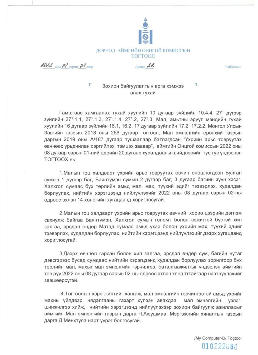 Дорнод аймгийн Онцгой комиссоос энэ сарын 3-ны өдөр малын гоц халдвар гарсан бүсэд хөл хорио тогтоох захирамж гаргажээ. Тодруулбал, Малын гоц халдварт үхрийн арьс товруутах өвчин оношлогдсон Булган сумын 1 дүгээр баг, Баянтүмэн сумын 2 дугаар баг, 3 дугаар багийн зүүн хэсэг, Халхгол сумаас бүх төрлийн амьд мал, мах, түүхий эдийг тээвэрлэх, худалдан борлуулах, нийтийн хэрэгцээнд нийлүүлэхийг 2022 оны наймдугаар сарын 02-ны өдрөөс эхлэн 14 хоногийн хугацаанд хориглосон байна.