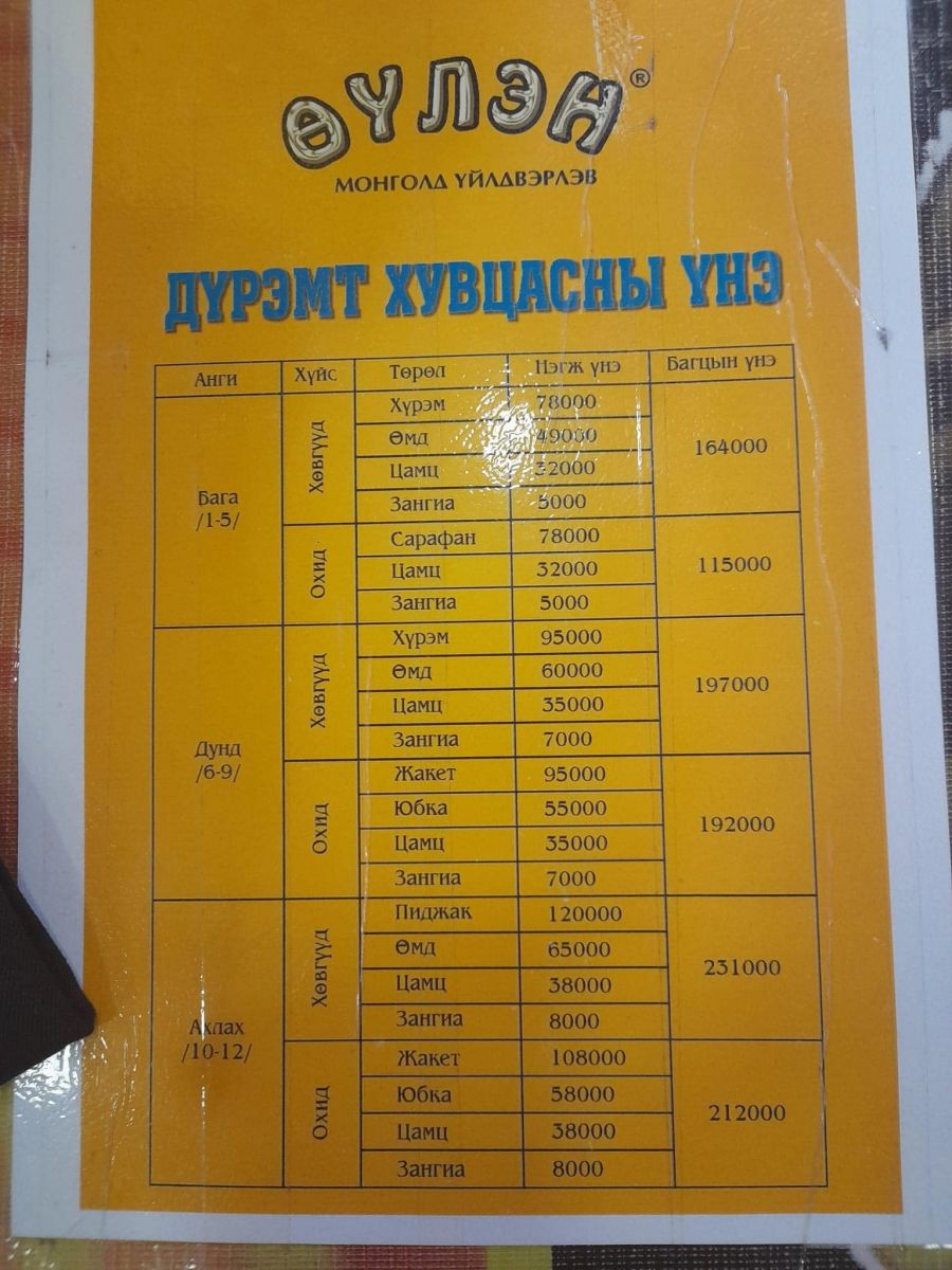 Бага ангийн хөвгүүдийн дүрэмт хувцасны хоёр хос 70 мянган төгрөг, охидын сарафан 60 мянган төгрөг, дунд ангийн хөвгүүд, охидынх 90 мянган төгрөг, ахлах ангийн хөвгүүдийнх 130 мянган төгрөг, охидынх 120 мянган төгрөгөөр худалдаалагдаж байна. Мөн тааран цэнхэр, цагаан цамц 25-28 мянган төгрөг, хөх өмд размераасаа хамаарч 28-42 мянган төгрөг, саарал өмд 45 мянган төгрөг, саарал майк 40 мянган төгрөг, бүстэй юбка 42 мянган төгрөгийн үнэтэй байлаа.