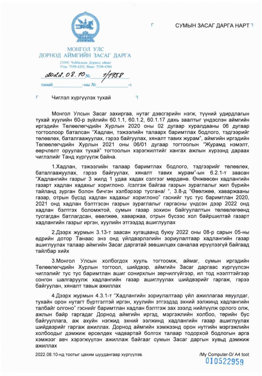 Мөн хадлан хадах газар нь сумын газар зохион байгуулалтын төлөвлөгөөнд батлагдсан байршилд байх бөгөөд малчин өрхийн өвөлжөө, хаваржаа, отрын бүсэд олгохгүй байхыг даалгалаа.