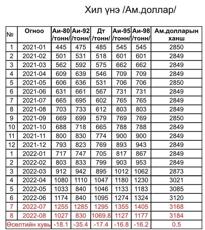 ОХУ-ын Роснефть компаниас 2022 оны наймдугаар сард манай улсад нийлүүлэгдэх А-80, Аи-95, Аи-98 автобензиний импортын хил үнэ тус бүр 18.1, 16.8, 16.2 хувиар, дизель түлш 17.4 хувиар тус бүр буурсан байна.