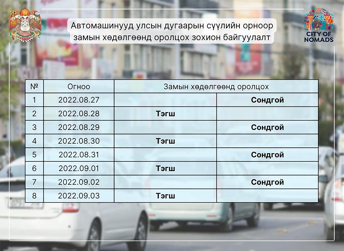 2022-2023 оны хичээлийн жил эхэлж буйтай холбоотойгоор замын хөдөлгөөний түгжрэлийг бууруулах зорилгоор замын хөдөлгөөнд оролцож буй тээврийн хэрэгслийг улсын дугаараар нь хязгаарлаж оролцуулах нийслэлийн Засаг даргын захирамж гарсан билээ. Ингэхдээ наймдугаар сарын 27-ны өдрөөс эхлэн ирэх сарын 3-ныг дуустал 08.00-20.00 цагийн хооронд дугаарын хязгаарлалттай зорчих юм.