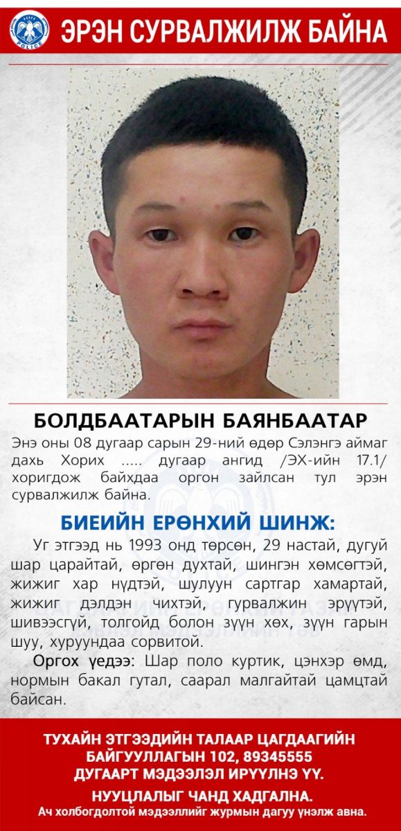 Сэлэнгэ аймаг дахь ШШГХ-413 дугаар нээлттэй, хаалттай хорих ангид ял эдэлж байсан Болдбаатарын Баянбаатар гэх этгээд өчигдөр /2022.08.29/ оргон зайлжээ. Иймд тухайн этгээдийг цагдаагийн байгууллагаас эрэн хайх ажиллагааг үргэлжлүүлж байна.