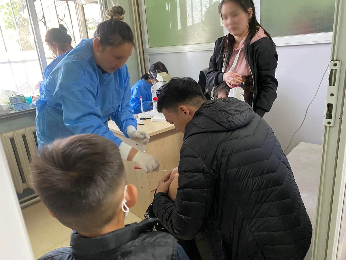 Тус эмнэлэг дээр 11.00 цагийн үед очиход эмнэлгийн гадаа хүүхдээ тэвэрч, хөтөлсөн хүмүүсийн дарааллын төгсгөл хаана байгаа нь үл мэдэгдэх урт цуваа үүсжээ. Бие биетэйгээ наалдах шахам зогссон эцэг эх, хүүхдүүд ихэнх нь маск зүүгээгүй байв. Шинжилгээ авч буй өрөөний үүд хүртэл зөрөх зайгүй оочирлосон байх бөгөөд шинжилгээний төлбөр болох 10 мянган төгрөгийг бэлнээр бэлдсэн байх ёстой аж. Шинжилгээг гурван эмч авч байсан юм. Цагаан хорхойн шинжилгээг чих ухагч хөвөнтэй мод шиг зүйлээр хүүхдийн бөгсний нүхэнд хийж аваад, түүнийгээ хуруу шилэнд хийж овог, нэр, нас, хүйсийг бичиж байв. Нэг хүүхдийн цагаан хорхойн шинжилгээг авахад ойролцоогоор 30 секунд зарцуулж байсан юм.