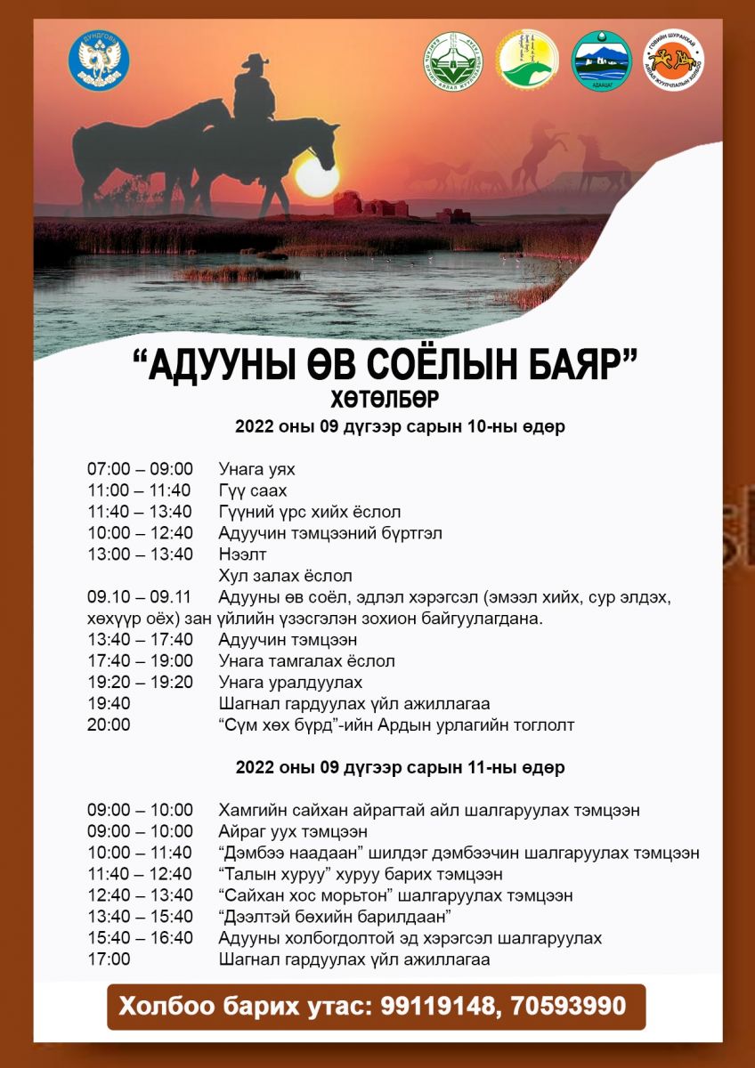 Баяраар гүүний үрс гаргах ёсон, адуучин тэмцээн, унага тамгалах ёсон, дэмбээ, талын хуруу, айраг уух, сайхан хос морьтон, дээлтэй бөхийн барилдаан зэрэг уралдаан тэмцээн болох аж.