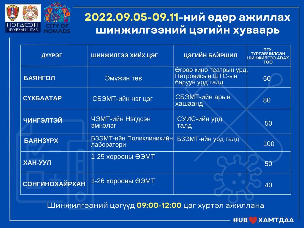 Ингээд 2022 оны есдүгээр сарын 5-11-ний өдрүүдэд ажиллах ковидын түргэвчилсэн шинжилгээний цэгийн хуваарийг танилцуулж байна.
