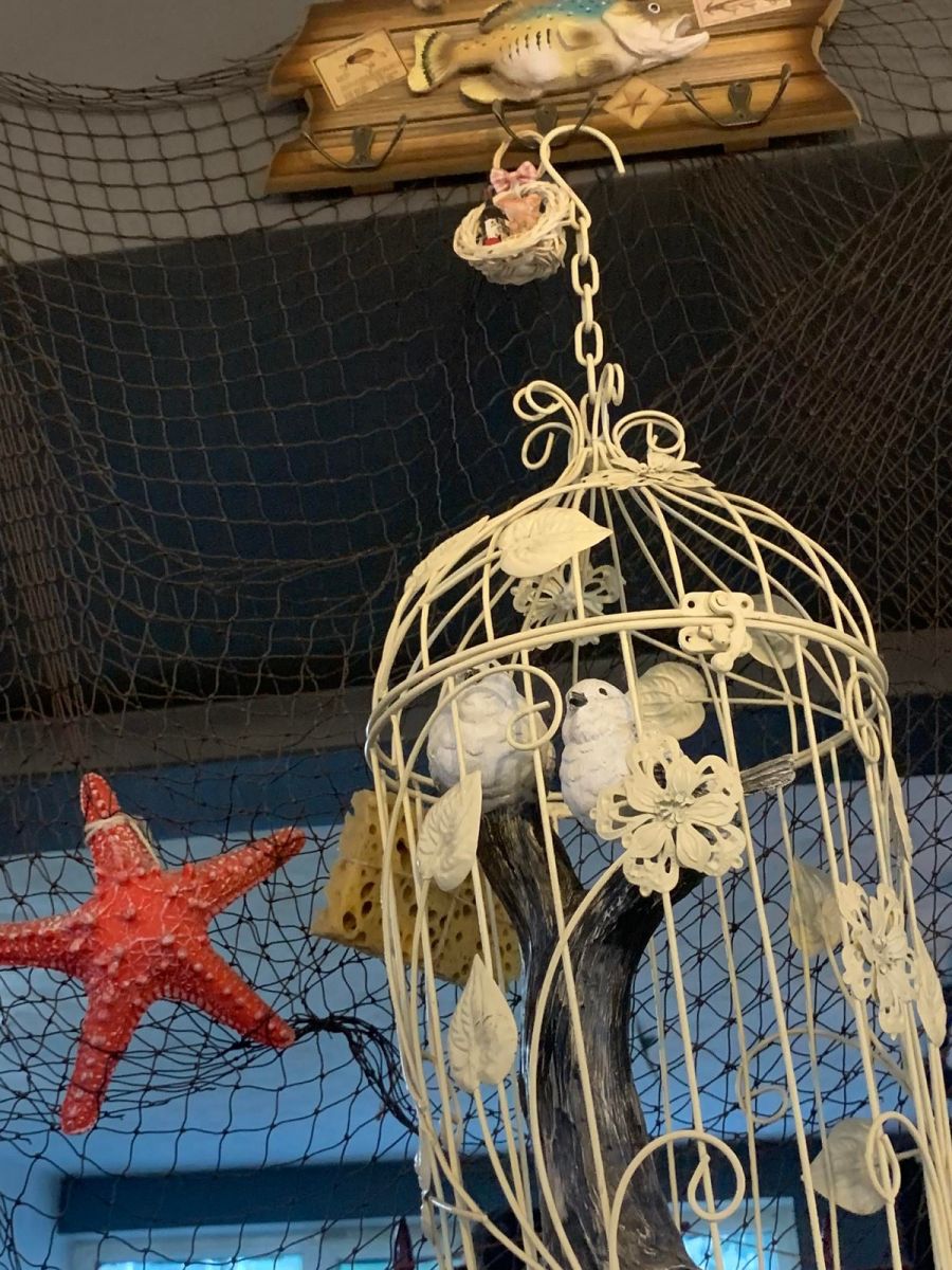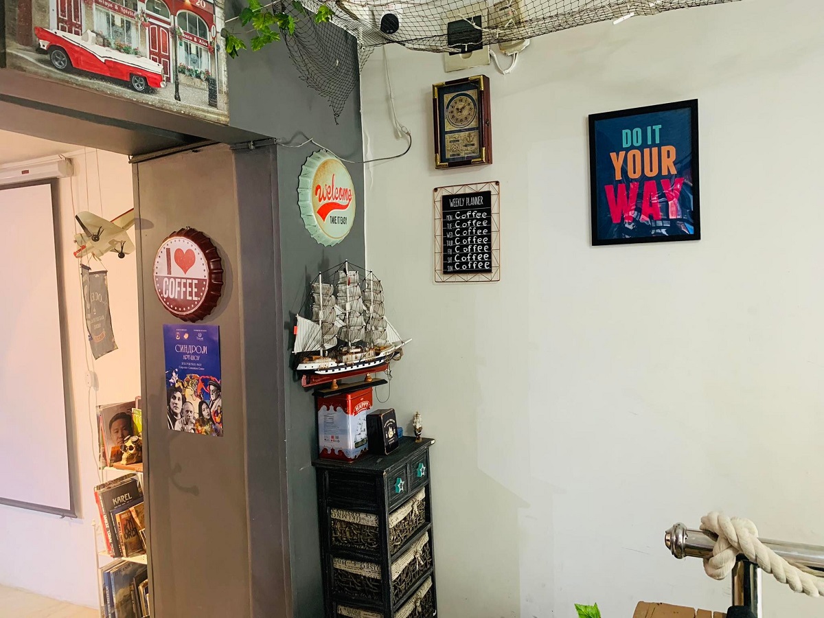Кофе шопынх нь тохижилт ямар догь гэж санана... Нэг ханандаа далайд хөвж буй том хөлөг онгоц зуржээ. Бусад хананд нь том жижиг хүрээтэй уран зургууд, бяцхан дарвуулт завь, хүрдэт цаг, сүлжмэл тор, гитар, хуучин чемодан, пянз тоглуулагч, төмөр пошкаар хийсэн явган ширээ, өнгө бараан буйдан… Энэ бүгд нийлээд эрт үеийн барууны кинон дээр гардаг хуучин дарвуулт завиар хаашаа ч юм аялж буй мэт. Харин том цонхтой зүүн талын тасалгаанд нь хар өнгийн тавиур дүүргэсэн “Үнэг”-ийн ном өнгө нэмнэ.