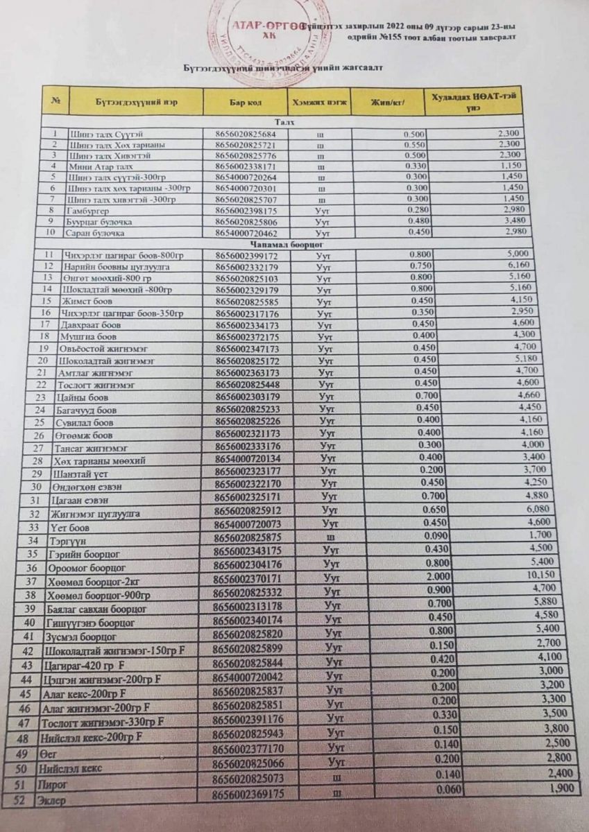 "Атар өргөө" ХК-ийн бүтээгдэхүүний үнийн шинэчилсэн жагсаалт