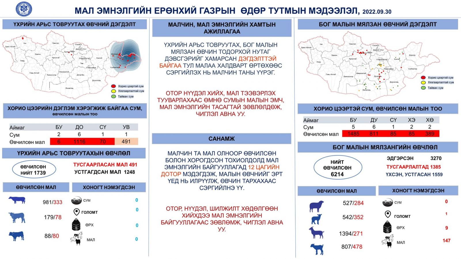 Хорио цээрийн дэглэмтэй бүс нутагт нийт 1739 мал өвчилсөн байгаа бөгөөд тэдгээрийн 1248-ыг нь устгалд оруулсан байна. Одоогоор 491 мал тусгаарлалтад байгаа ажээ.
