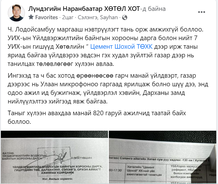 Тэрбээр “Ч.Лодойсамбуу маргааш нэвтрүүлэгт тань орж амжихгүй боллоо. УИХ-ын Үйлдвэржилтийн бодлогын байнгын хорооны дарга тэргүүтэй нийт долоон гишүүн Хөтөлийн “Цемент Шохой” ТӨХК дээр ирж, таны яриад байгаа үйлдвэрээ эвдсэн гэх худал зүйлтэй газар дээр нь танилцах төлөвлөгөөг хүлээн авлаа. Ингэхэд та ч бас хотод өрөөнөөсөө гарч, манай үйлдвэрт газар дээрээс нь улаан микрофоноо гаргаад ярилцаж болно шүү дээ. Энд одоо ажил ид бужигнаж, үйлдвэрлэл хэвийн, Дарханы замын бүтээн байгуулалтад цементээ нийлүүлээд явж байгаа. Таныг хүлээн авахдаа манай 820 гаруй ажилтан таатай байх болно” гэжээ.