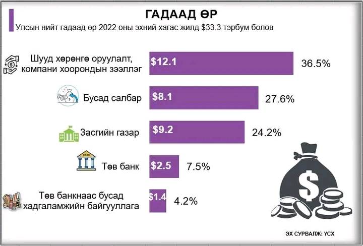 2022 оны 1 дүгээр улирлын эцэст, Монгол Улсын нийт гадаад өр 33.9 тэрбум ам.доллар байна. Энэ нь ОУВС-ийн аргачлалаар тооцож гаргадаг статистик үзүүлэлт бөгөөд, дотор нь зээл, бондоос гадна хөрөнгө оруулалтууд ч багтдаг. Жишээ нь Оюу толгой дээр гэхэд хэдийгээр статистик аргачлалаар өр гэж бүртгэж байгаа ч экспорт хийгээд, татвар төлөөд явж байгаа дефолтын эрсдэлгүй цэвэр хөрөнгө оруулалт явж байгаа юм.