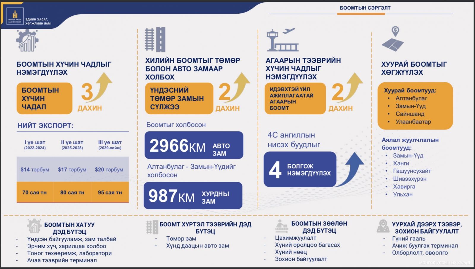 Засгийн газрын Хэрэг эрхлэх газрын дарга Д.Амарбаясгалан: Монгол Улсын хилийн боомтуудаас төмөр замаар 3 боомт, авто замаар 6 боомт холбогдсон байдаг. Харин БНХАУ-ын талаас Бичигт, Ханги, Гашуунсухайт, Шивээхүрэн боомт хүртэлх төмөр замын бүтээн байгуулалт дуусаж байна. Булган, Шивээхүрэн, Гашуунсухайт, Ханги, Бичигт боомтууд хүртэлх авто замын бүтээн байгуулалтын ажил дууссан. Тиймээс бид БНХАУ-аас авч хэрэгжүүлж буй боомтуудын хөгжлийн төлөвлөгөө болон БНХАУ-ын авто зам, төмөр замын дэд бүтэцтэй уялдуулан дотоодын зам харилцааг хөгжүүлж чадсанаар олон улсын аль ч зах зээлд гарах, өрсөлдөх чадвараа дээшлүүлэх боломж бүрдэнэ. Иймд уул уурхайн томоохон ордуудыг ашиглах, тэдгээрийг олон улсын зах зээлд өндөр үнээр гаргах нөхцөл боломжуудыг хангах томоохон авто замын төслүүдийг хэрэгжүүлж Ханги, Цагаандэл, Бургастай, Цагааннуур, Тэс, Арцсуурь, Ханх, Бага Илэнхи, Зэлтэр, Ульхан, Хавирга, Сүмбэр, Баянхошуу, Бичигт зэрэг боомтуудыг авто замаар холбох, Алтанбулаг-Замын-Үүд боомтуудыг холбосон 987 километр хурдны замыг барих, Гашуунсухайт, Ханги, Бичигт, Шивээхүрэн, Арцсуурь боомтуудыг төмөр замаар холбох томоохон төслүүдийг хэрэгжүүлэх, боомт хүртэлх төмөр зам, авто замын бүтээн байгуулалтад хувийн хэвшлийн бүтээн байгуулалт, санхүүжилт, төр хувийн хэвшлийн түншлэлийг дэмжих чиглэлд Засгийн газар анхаарч ажиллаж байна. Хилийн боомтын тухай хуультай болох зайлшгүй шаардлага бий. Төр-хувийн хэвшлийн түншлэлийн тухай хуулийн төслийг олон улсын байгууллага, мэргэжлийн холбоодоо санал авч боловсруулаад Улсын Их Хуралд өргөн мэдүүлсэн. Боомтын асуудал хариуцсан сайдыг ойрын хугацаанд томилно.