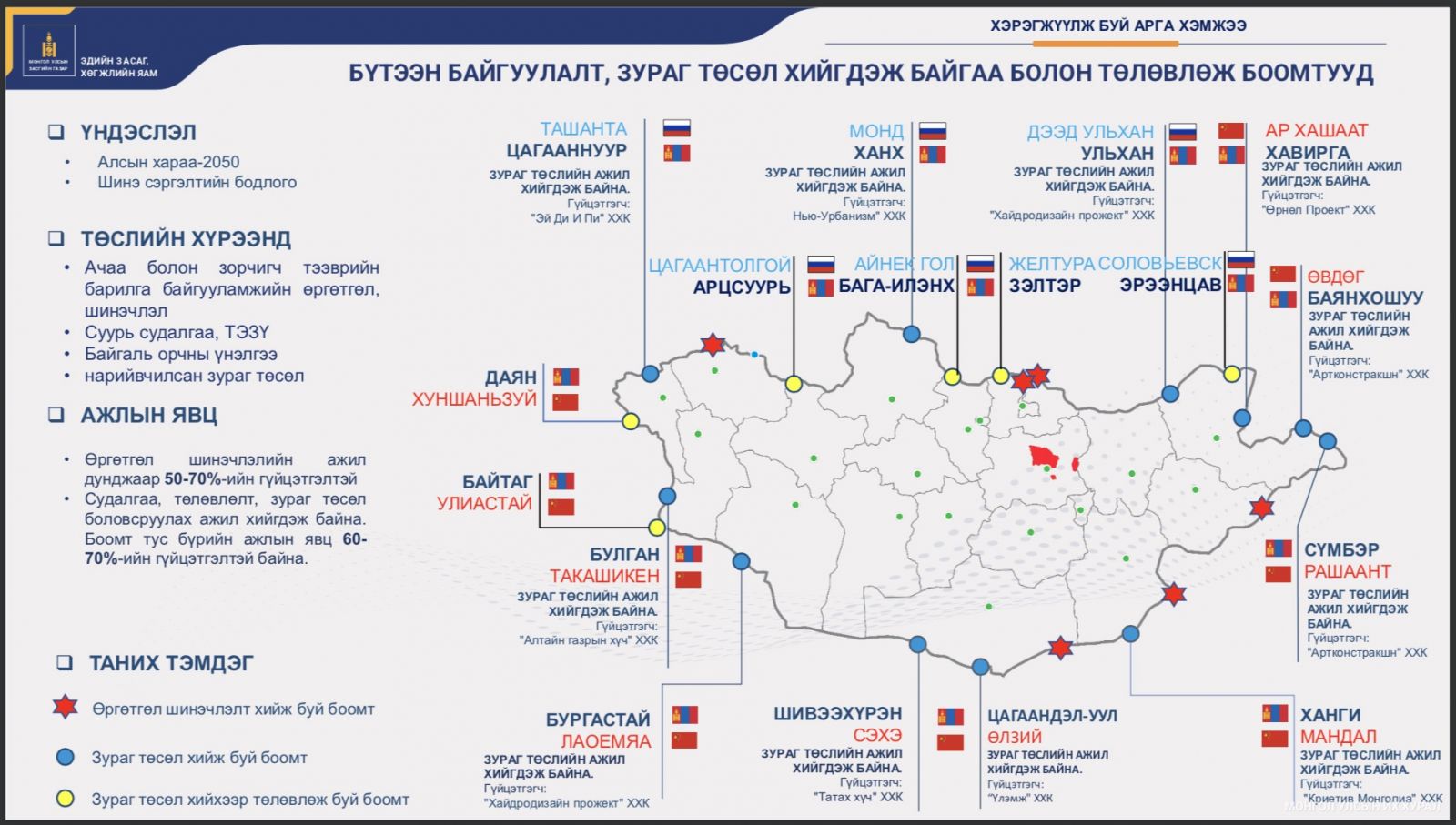 Одоогийн байдлаар 6 боомт дээр бүтээн байгуулалт хийгдэж байгаа бөгөөд өргөтгөл шинэчлэлтийн ажил дунджаар 50-70 хувийн гүйцэтгэлтэй байна. Мөн 11 боомтыг бүтээн байгуулалтын судалгаа, төлөвлөлт, зураг төсөл боловсруулах ажлыг хийж байгаа. Боомт тус бүрийн ажлын явц 60-70 хувийн гүйцэтгэлтэй байгааг Эдийн засаг, хөгжлийн яамны Төрийн нарийн бичгийн дарга Ж.Батжаргал хэллээ.