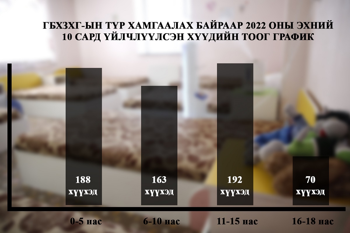 Хүүхдийн хүчирхийллийн эсрэг төвд бэлгийн хүчирхийллийн золиос болсон 13-17 насны хүүхдүүд ихэвчлэн ханддаг бөгөөд энэ он гарсаар 21 хүүхдэд өмгөөллийн үйлчилгээ үзүүлжээ. Харин Гэр бүл, хүүхэд залуучуудын хөгжлийн газар энэ онд нийт 611 хүүхэд түр хамгаалах байранд хүлээн авчээ. Үүнээс эрэгтэй 297, эмэгтэй 314 хүүхэд, 0-5 насны 188, 6-10 насны 163, 11-15 насны 192, 16-18 насны 70 хүүхэд байна. Хүчирхийллийн хэлбэрээр ангилж үзэхэд бие махбодийн хүчирхийлэлд өртсөн хүүхэд 83, үл хайхрах хүчирхийлэлд 344, бэлгийн хүчирхийлэлд 48, сэтгэл санааны хүчирхийлэлд 35, гуйлга гуйсан 11, төөрсөн 21, хараа хяналтгүй 38 хүүхэд хохирчээ. Гэр бүл, хүүхэд залуучуудын хөгжлийн газрын түр хамгаалах байранд одоогоор 27 хүүхэд байгааг мэргэжилтнүүд хэллээ. Судалгаанаас үзэхэд хүүхэд хүчирхийллийн золиос болж буй шалтгааны 70 хувь нь архины хамаарлаас, үлдсэн 30 хувь нь эцэг эхийн хараа хяналт, гэр бүл салалт, маргаан уур бухимдал, хоол ундны хүрэлцээ, сэтгэцийн эмгэг зэргээс үүдэлтэй аж. Түүнчлэн дийлэнх хувь буюу 56 хувийг үл хайхрах хүчирхийллийн тохиолдол эзэлдэг гэнэ.