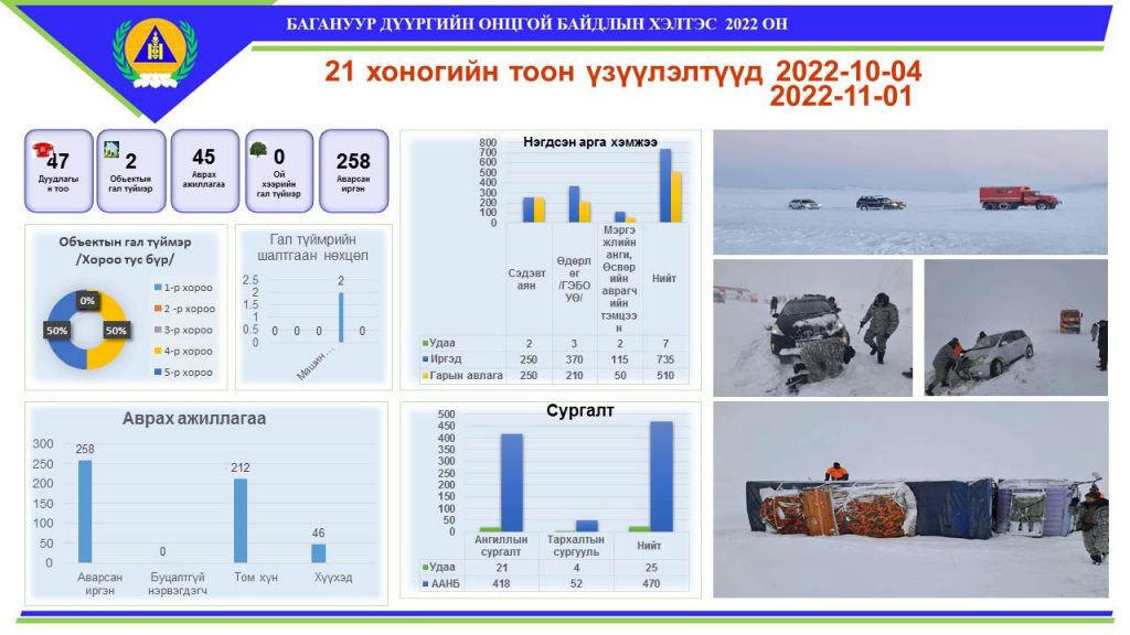 Багануур дүүргийн удирдах ажилтны ээлжит шуурхай хуралдаан өнөөдөр /2022.11.01/ боллоо. Энэ үеэр тус дүүргийн Онцгой байдлын хэлтссийн дарга, дэд хурандаа Г.Батжаргал өнгөрөгч 14 хоногийн мэдээллээ танилцуулсан юм. Тэрбээр “Өнгөрсөн хугацаанд 47 удаагийн дуудлагаар үүрэг гүйцэтгэж, обьектийн 2 гал түймрийг аюулгүй болгож, цасанд суусан 45 автомашиныг цаснаас гарган, 258 иргэний аюулгүй байдлыг ханган ажилласан” гэв.