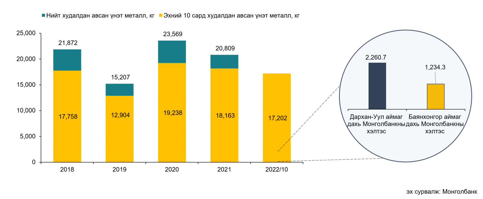 Оны эхнээс өссөн дүнгээр Дархан-Уул аймаг дахь Монголбанкны хэлтэс 2,260.7 кг, Баянхонгор аймаг дахь Монголбанкны хэлтэс 1,234.3 кг үнэт металл тус тус худалдан авжээ.