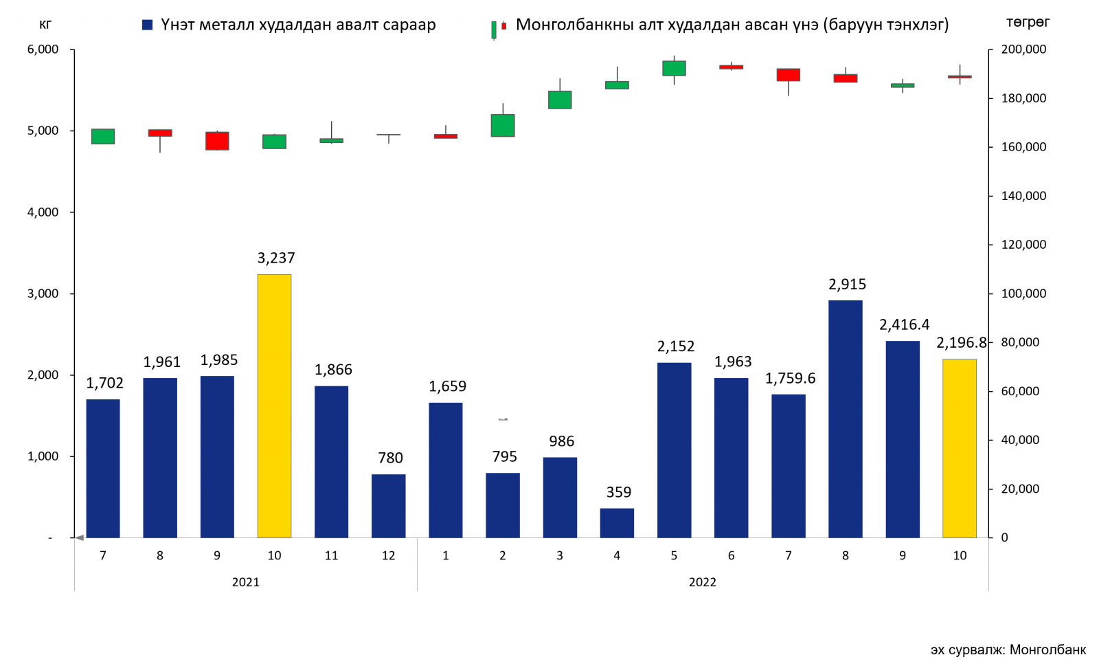 Монголбанкны худалдан авсан үнэт металлын хэмжээ (2018-2022/10)