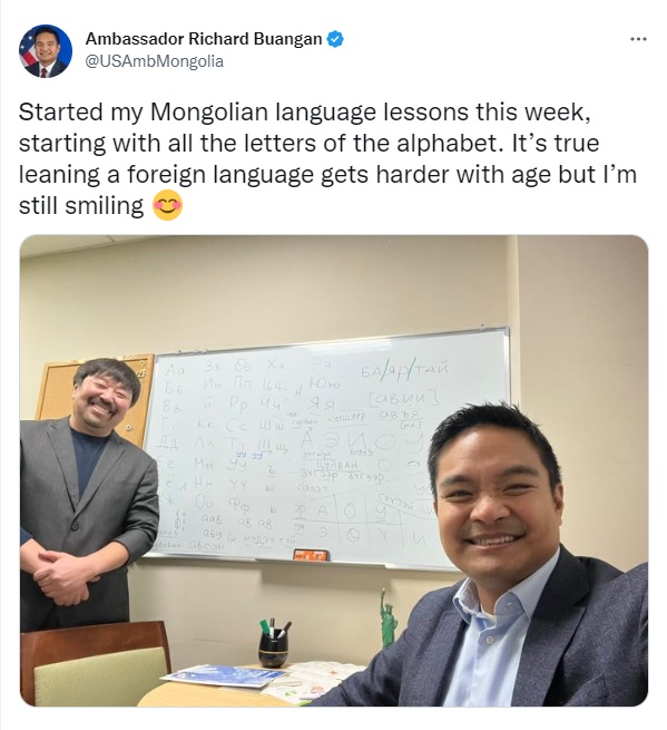 АНУ-аас Монгол Улсад суух онц бөгөөд Бүрэн эрхт Элчин сайдаар томилогдсон Ричард Буанган энэ сарын 1-нээс ажилдаа орсон. Тэрээр монгол хэлний хичээл хийж эхэлснээ твиттер хуудсаараа дамжуулан жиргэсэн байна.