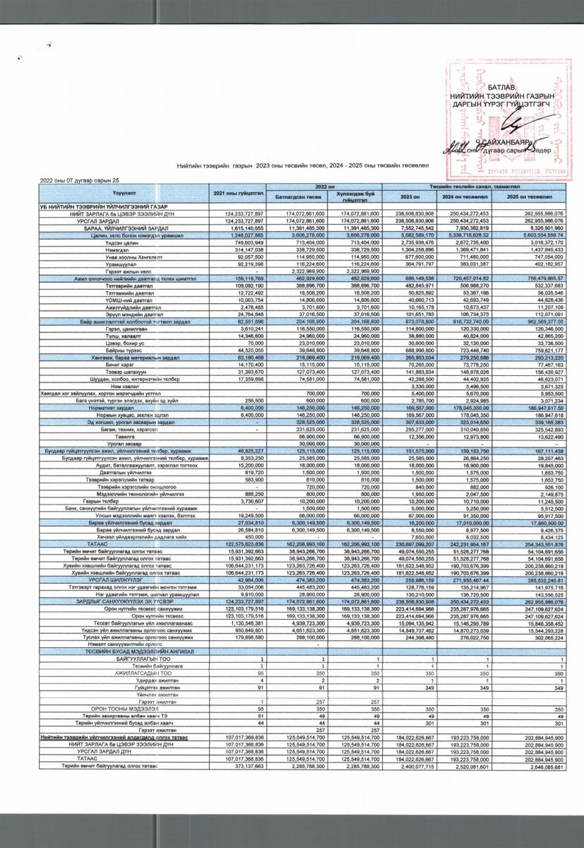 Жишээлбэл, цалин хөлс болон нэмэгдэл урамшууллын үзүүлэлт 2021 онд 1.2 тэрбум төгрөг байсан бол энэ онд 3.6 тэрбум төгрөг болон өсжээ. Харин ирэх онд 5.8 тэрбум төгрөг болгон нэмэгдүүлэх аж.