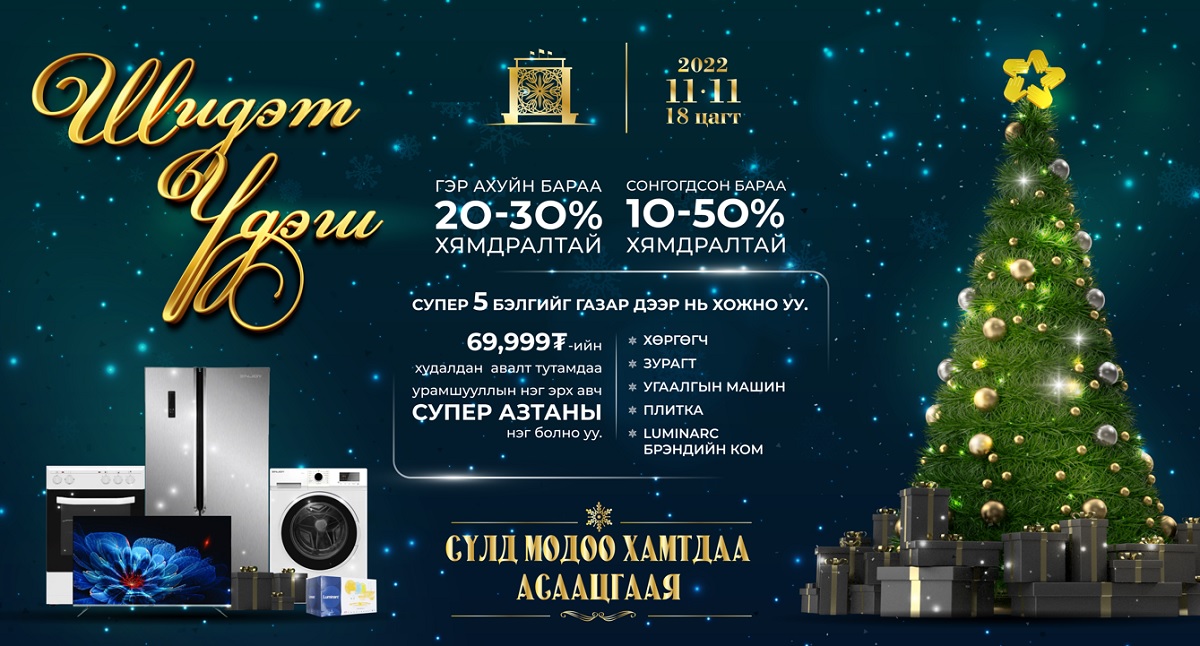 Зөвхөн 11-р сарын 11-ний өдөр Улсын их дэлгүүрт 10-50% хүртэл хямдралтай, сонгогдсон тасгууд бэлэгтэй, 1-7 давхрын аль ч тасгаас хийсэн 69'999 төгрөгийн худалдан авалт тутамд нэг урамшууллын эрхээр ENJOY брэндийн хөргөгч, угаалгын машин, зурагт, плитка, Luminarc брэндийн ком зэрэг супер 5 бэлгийн эзэн болно.