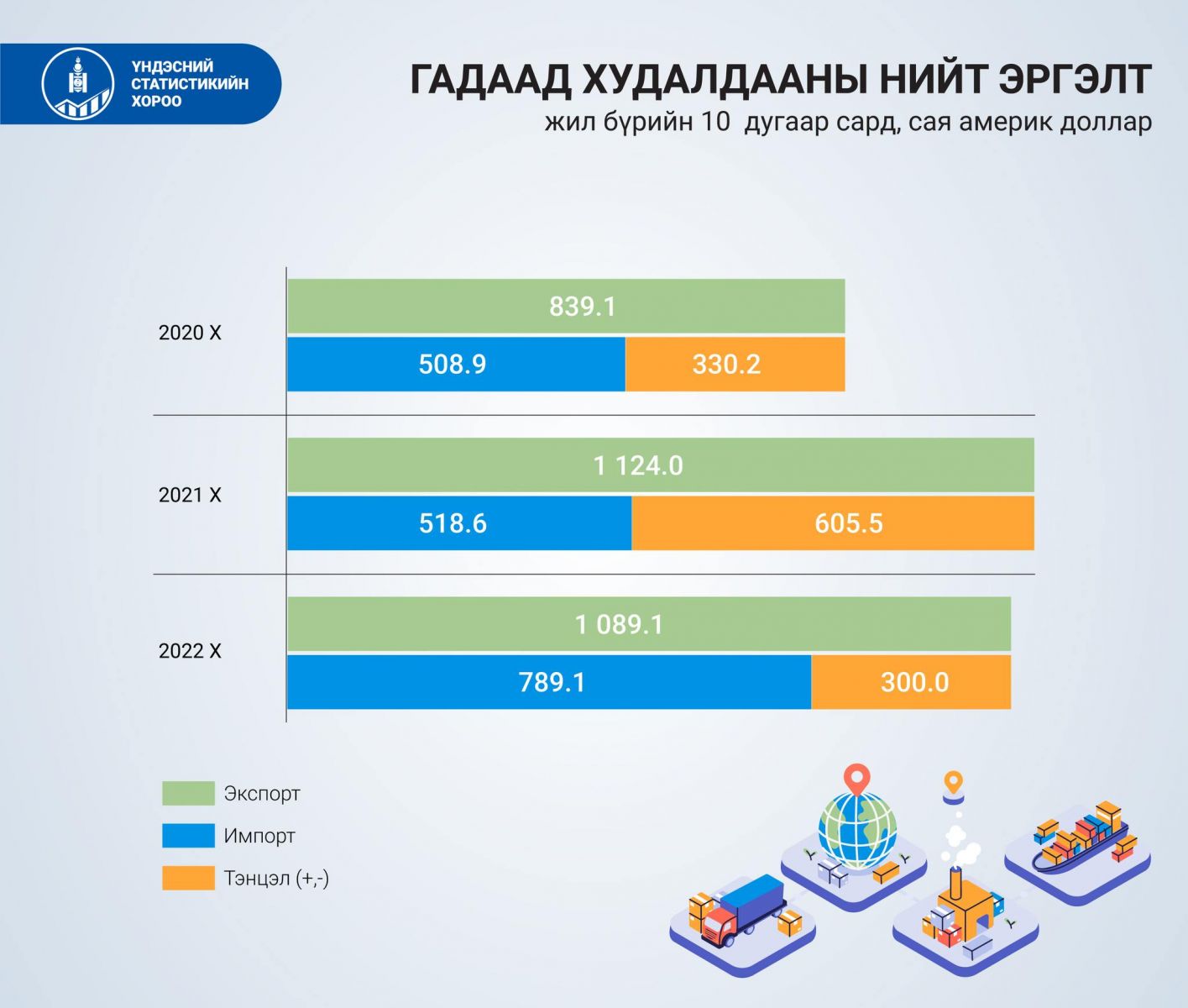 Гадаад худалдааны тэнцэл 2022 оны эхний арван сард 2.9 тэрбум ам.долларын ашигтай гарч, өмнөх оны мөн үеэс 1.0 тэрбум ам.доллароор буюу 52.4% өсжээ. Харин аравдугаар сард 300.0 сая ам.долларын ашигтай гарч, өмнөх сараас 106.8 сая ам.доллароор буюу 26.3% буурсан гэж статистикчид тайлбарлаж байна.