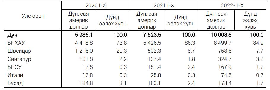 Гадаад худалдааны тэнцэл 2022 оны эхний арван сард 2.9 тэрбум ам.долларын ашигтай гарч, өмнөх оны мөн үеэс 1.0 тэрбум ам.доллароор буюу 52.4% өсжээ. Харин аравдугаар сард 300.0 сая ам.долларын ашигтай гарч, өмнөх сараас 106.8 сая ам.доллароор буюу 26.3% буурсан гэж статистикчид тайлбарлаж байна.