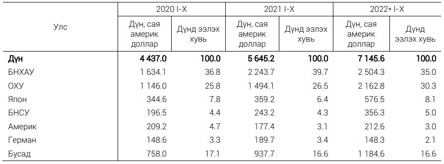 Импортын дүнд 2022 оны эхний арван сарын байдлаар БНХАУ 35%, ОХУ 30.3%, Япон 8.1%, БНСУ 5%, АНУ 3%, ХБНГУ 2.1 хувийг тус тус эзэлж, нийт импортын 83.4 хувийг бүрдүүлжээ.