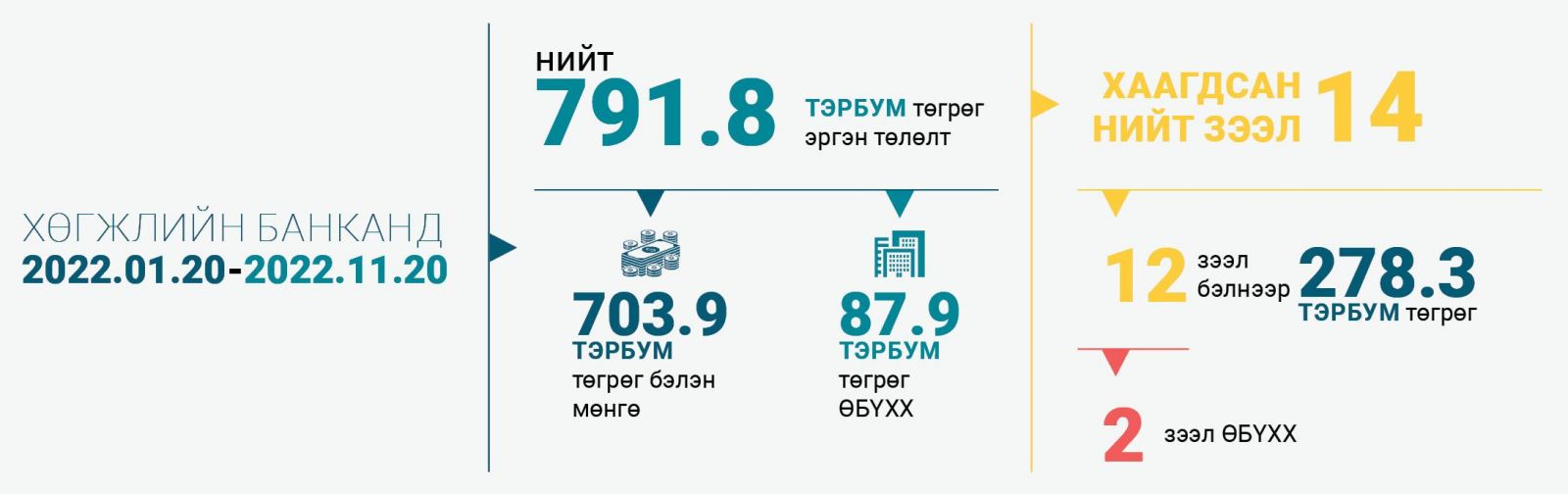 Хөгжлийн банканд 2022 оны нэгдүгээр сарын 20-ны өдрөөс хойш арваннэгдүгээр сарын 20-ны өдрийг хүртэлх хугацаанд нийт 791.8 тэрбум төгрөгийн зээлийн эргэн төлөлт хийгджээ. Үүнээс 703.9 тэрбум төгрөг бэлэн мөнгөөр, 87.9 тэрбум төгрөг нь өмчлөх бусад үл хөдлөх хөрөнгөөр эргэн төлөгдсөн байна.