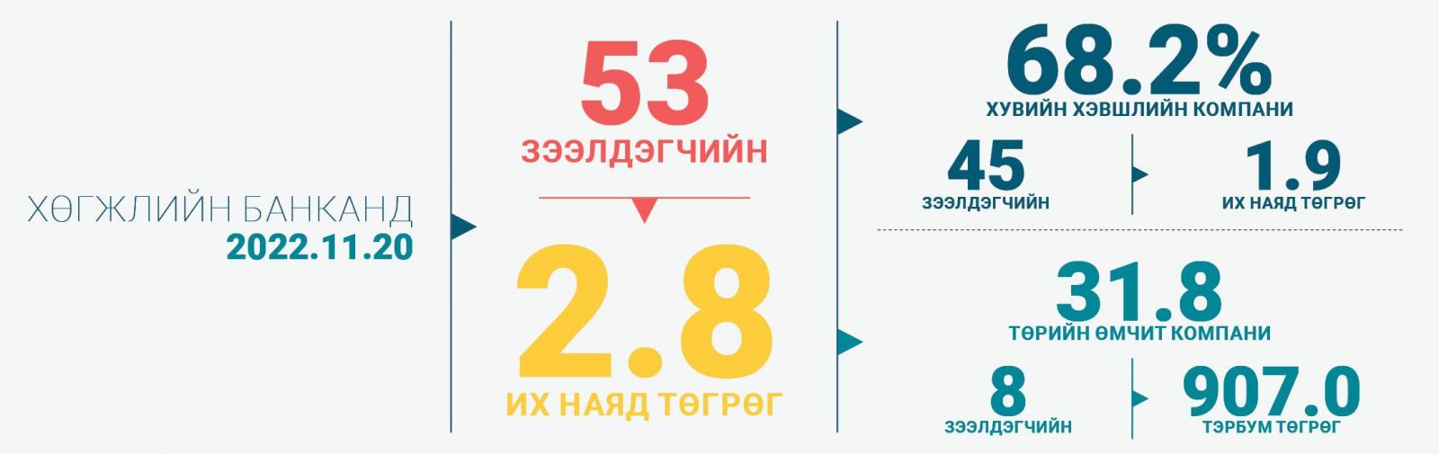Үүнээс 31.8% нь төрийн өмчит компанийн 8 зээлдэгчийн 907 тэрбум төгрөгийн, 68.2% нь хувийн хэвшлийн 45 зээлдэгчийн 1.9 их наяд төгрөгийн зээл, хүүгийн үлдэгдэл аж.