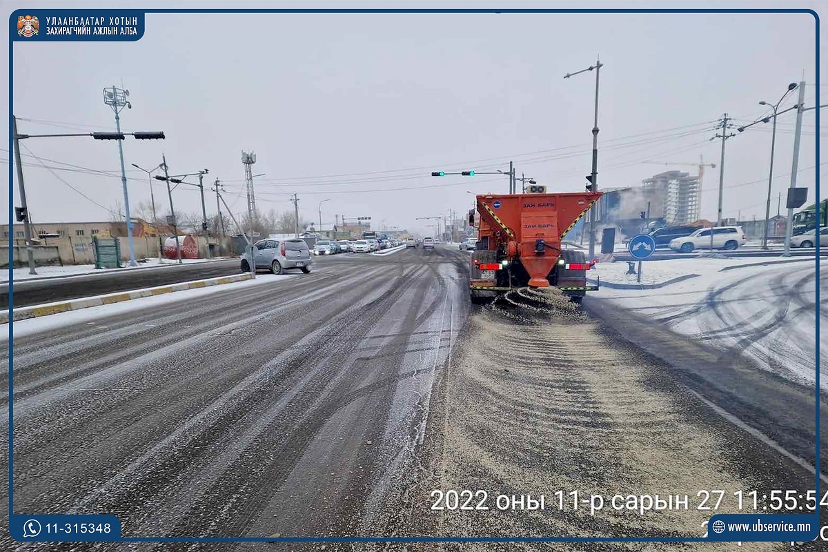 Нийслэлийн хот тохижилтын газраас зам талбайн цэвэрлэгээний 17 байгууллагын 98 машин техник, 758 зам талбайн үйлчлэгч 13.3 сая мкв талбайн цэвэрлэгээг хийж гүйцэтгэж байгаа аж. Өнөөдрийн байдлаар зам талбайн халтиргаа, гулгаа арилгах зориулалтын бодис 2503 тонн, давс 3996 тонн нөөцтэй байна. Улаанбаатар хотын Захирагчийн ажлын албанаас мэдээлж буйгаар, цас цэвэрлэгээнд зам, талбайн цэвэрлэгээний 18 байгууллагын 1063 үйлчлэгч тусгай зориулалтын 151 машин техниктэй ажиллажээ. Улмаар авто замын зорчих хэсэгт халтиргаа гулгаанаас сэргийлэх зориулалтын 173.5 тонн бодис, 190 тонн давс цацах ажлыг арваннэгдүгээр сарын 28-ны 05.00 цаг хүртэл өдөр, шөнийн ээлжээр хийж гүйцэтгээд буй юм.