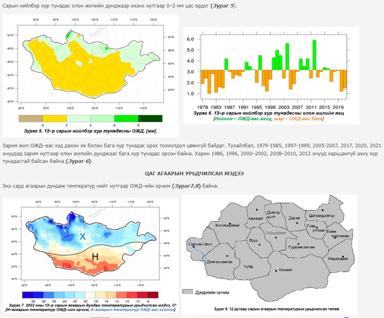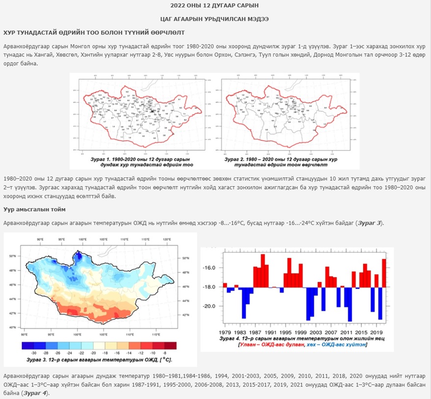 Ус, цаг уурын орчны шинжилгээний төвийн мэдээнд "Ирэх 12-р сарын нэгдүгээр арав хоногийн эхэн болон дунд үе, хоёрдугаар арав хоногийн ихэнх хугацаанд болон гуравдугаар арав хоногийн эхээр ОЖД–аас хүйтэн, харин нэг болон гуравдугаар арав хоногийн сүүлчээр ихэнх нутгаар ОЖД–аас бага зэрэг дулаан байх төлөвтэй байгаа бол нэгдүгээр арав хоногийн эхэн болон сүүлч, хоёрдугаар арав хоногийн дунд үе, гуравдугаар арав хоногийн дунд болон сүүлчээр ихэнх нутгаар цас орж, салхи зарим үед 14–16 м/с, зарим үед түр зууртаа 18–20 м/с хүрч цасан болон шороон шуурга шуурч болзошгүй байна. Тиймээс малчид, ард иргэд өвөлжилтийн бэлтгэл байдалдаа онцгойлон анхаарна уу" гэжээ.