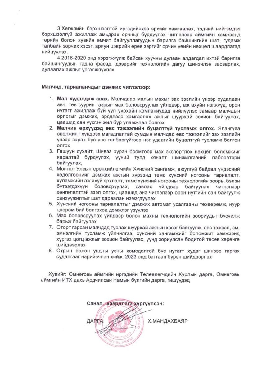 - Гурван тонн нүүрс үнэ төлбөргүй олгох. Орон нутгийн өмчит “Таван Толгой” ХК-ийн Төлөөлөн Удирдах Зөвлөлийн орон нутгийн өмчийн төлөөлөлд чиглэл өгч, аймгийн хэмжээнд хэрэгцээт айл өрх бүрт гурван тонн нүүрсийг үнэ төлбөргүй олгон, тээврийн зардлыг орон нутгийн төсвөөс санхүүжүүлэх.