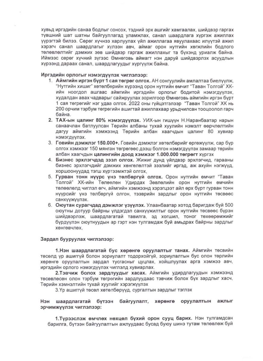 - Аймгийн иргэн бүрт 1 сая төгрөг олгох. АН сонгуулийн амлалтаа биелүүлж, “Нутгийн хишиг” хөтөлбөрийн хүрээнд орон нутгийн өмчит “Таван Толгой” ХК-ийн ноогдол ашгаас аймгийн иргэдийн орлогыг бодитой нэмэгдүүлэх, худалдан авах чадварыг сайжруулах зорилгоор Өмнөговь аймгийн иргэн бүрт 1 сая төгрөгийг нэг удаа олгох. 2022 оны гүйцэтгэлээр “Таван Толгой” ХК нь 200 орчим тэрбум төгрөгийн ашигтай ажиллахаар урьдчилсан тооцоолол гарч байна.