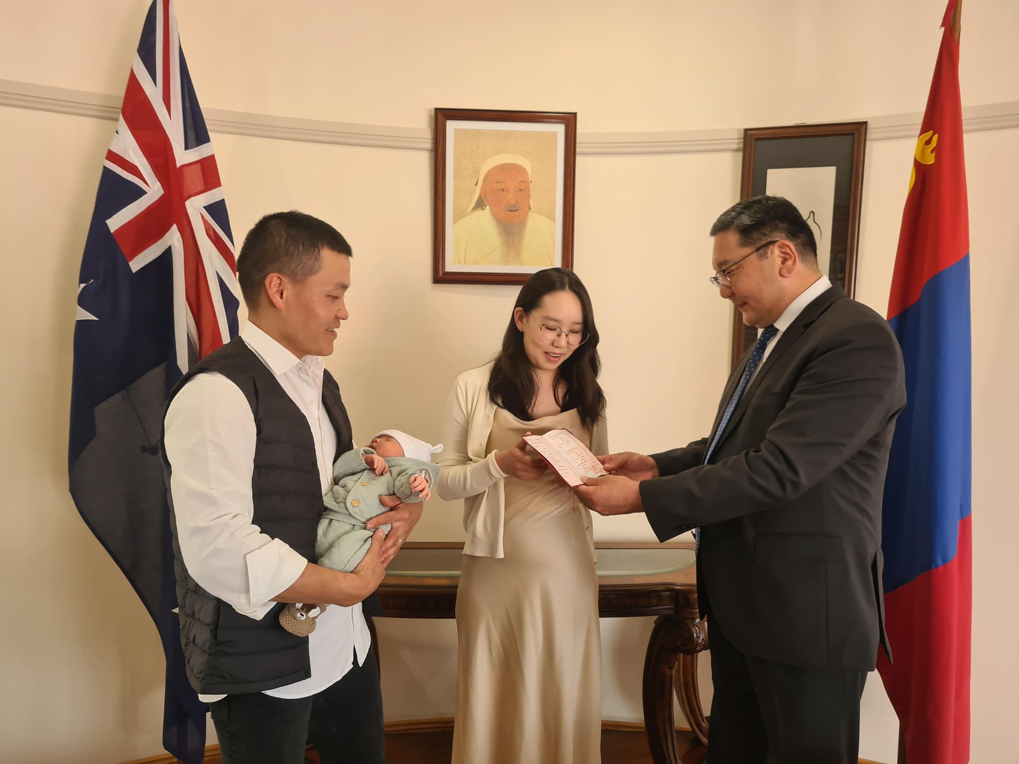 Австрали тивд амьдарч буй Монголын залуу гэр бүлийн төлөөлөл болсон Б.Ананд, Э.Лхагвасүрэн нарын ууган хүү болон мэндэлсэн А.Мэргэн хүү өнөөдөр албан ёсоор Монгол Улсын иргэний гэрчилгээгээ авсан байна.