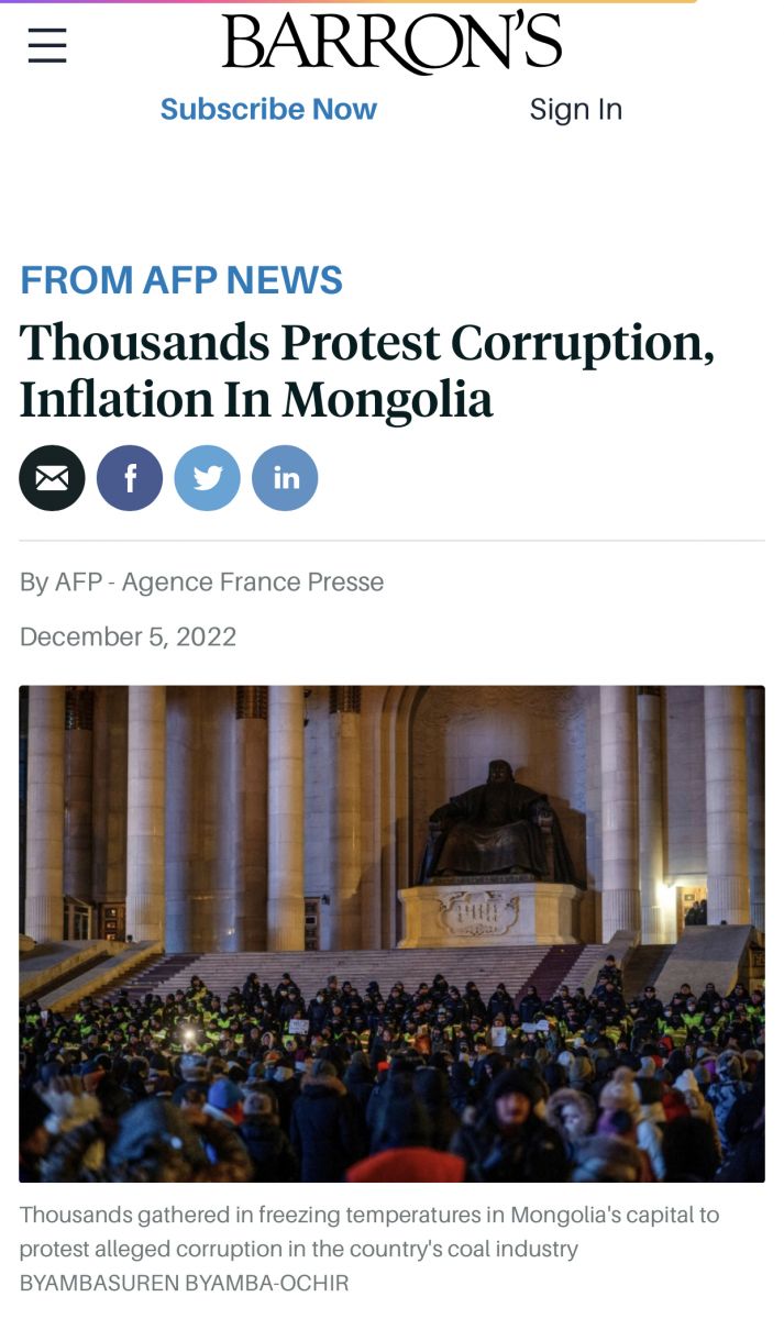 Америкийн News Corp хэвлэл мэдээллийн корпорацын долоо хоног тутмын мэдээллийн сонин сэтгүүл “Barron’s” Улаанбаатар хотод өрнөсөн жагсаалын үйл ажиллагааны талаар гаргасан AFP мэдээллийн агентлагийн мэдээллийг “МОНГОЛЫН МЯНГА МЯНГАН ИРГЭД АВЛИГА, ИНФЛЯЦЫГ ЭСЭРГҮҮЦЛЭЭ” гарчигтайгаар нийтлэв. Ерөнхийдөө бүгд нэг агуулгыг барьж мэдээлж байгаа юм.