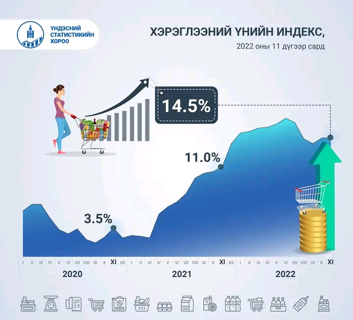 Инфляц буюу хэрэглээний бараа, үйлчилгээний үнэ 2022 оны арваннэгдүгээр сард улсын хэмжээнд өмнөх оны мөн үеэс 14.5 хувь, өмнөх оны эцсээс 12.1 хувиар, өмнөх сараас 1.1 хувиар өссөн гэж Үндэсний статистикийн хорооноос танилцууллаа.