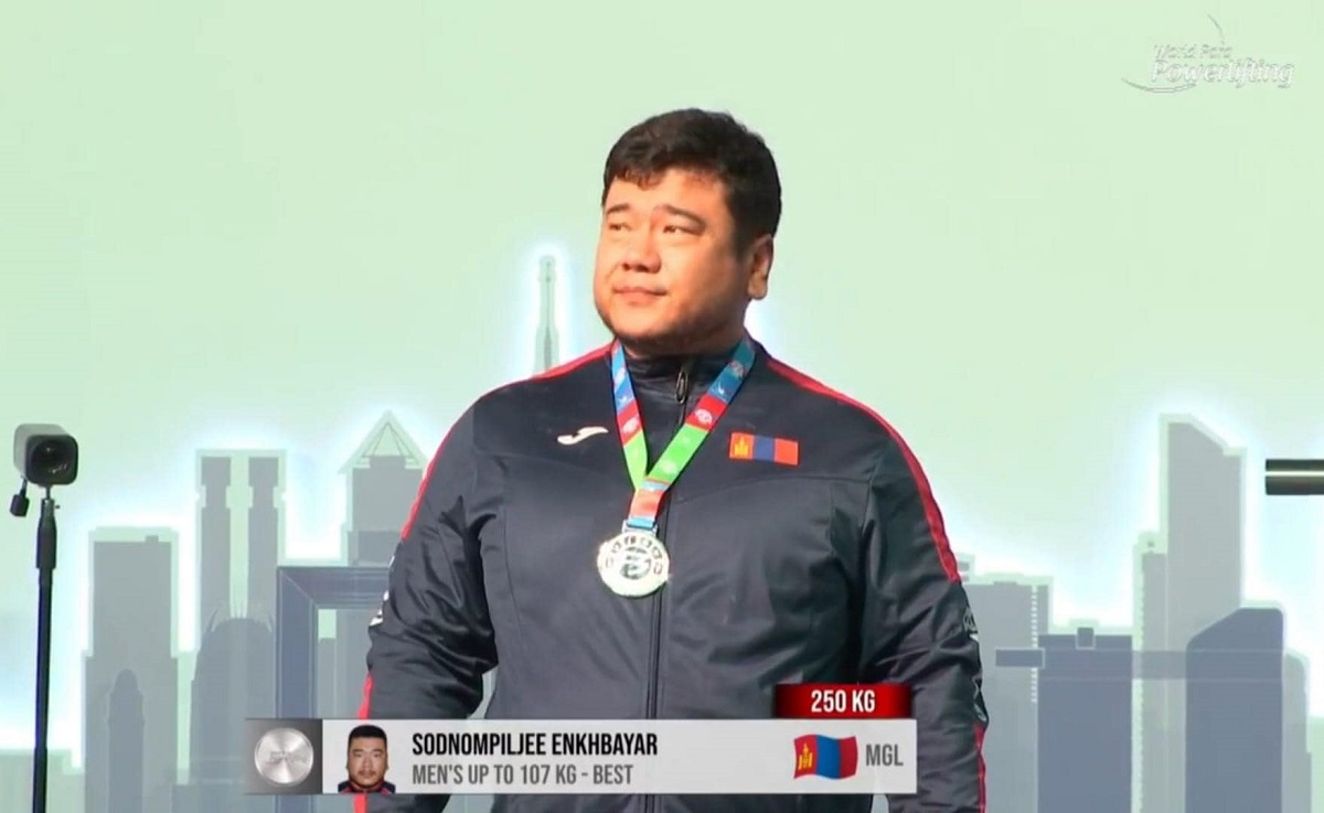 АНЭУ-ын Дубай хотод пара пауэрлифтингийн дэлхийн цомын тэмцээн болж байгаа бөгөөд Монгол Улсаас гавьяат дасгалжуулагч Д.Баттулгын удирдлага дор Үндэсний шигшээ багийн тамирчин, паралимпын алт, хүрэл, ДАШТ-ий хошой аварга, Хөдөлмөрийн баатар, гавьяат тамирчин Э.Содномпилжээ өрсөлдлөө. Э.Содномпилжээ 107 кг-ын жинд цээжнээс 250 кг-ыг шахсанаар мөнгөн медаль хүртлээ. Түүний оролцсон жинд Иран улсын тамирчин алтан медаль хүртсэн бол Йордан улсын тамирчин хүрэл медаль хүртэв.