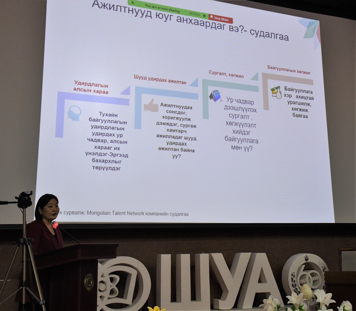 Төрийн албаны өөрчлөлт шинэчлэлийг даган Шинжлэх ухааны салбарын удирдах ажилтны менежмент, хүний нөөцийн удирдлага, манлайллын ур чадварыг дээшлүүлэх замаар байгууллагын хүний нөөцөө тасралтгүй хөгжүүлж байгууллагын стратеги зорилгыг хангах, байгууллагын хүний нөөцийн асуудал хариуцсан орон тоо, албан тушаал бий болгох хэрэгцээ, шаардлага тулгарч байна” гэдгийг хэлж байлаа.