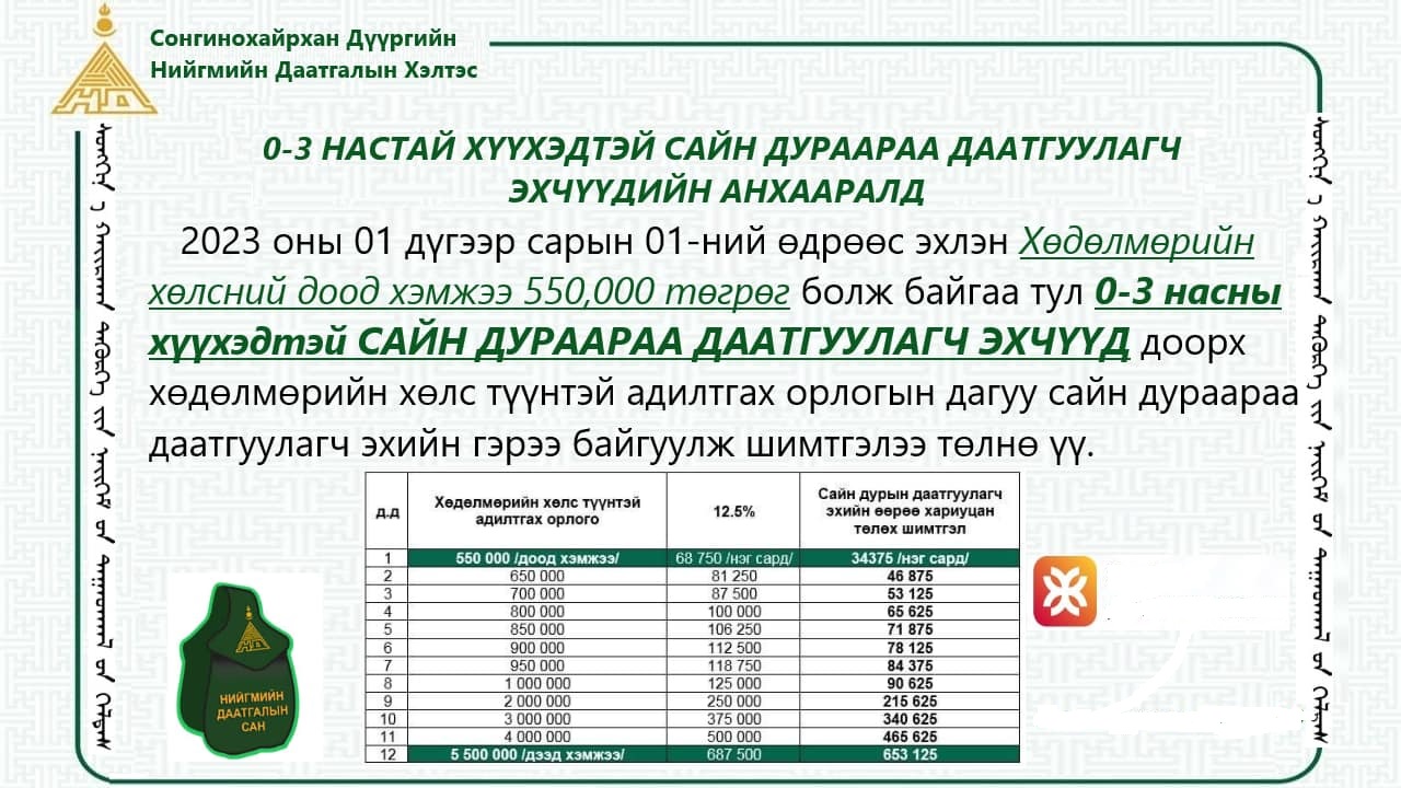 2023 оны нэгдүгээр сарын 1-ний өдрөөс хөдөлмөрийн хөлсний доод хэмжээ 550 мянган төгрөг болж өөрчлөгдсөнтэй холбоотойгоор 0-3 насны хүүхэдтэй, сайн дураараа даатгуулагч эхчүүдийн нийгмийн даатгалын шимтгэл төлөлтийн хураамжийн хэмжээ нэмэгдэж байна.