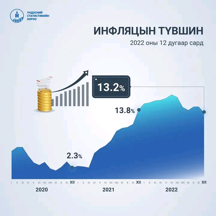 Инфляц буюу хэрэглээний бараа, үйлчилгээний үнэ 2022 оны 12 дугаар сард өмнөх оны мөн үеэс 13.2 хувиар өссөн гэж ҮСХ-ноос мэдээллээ.