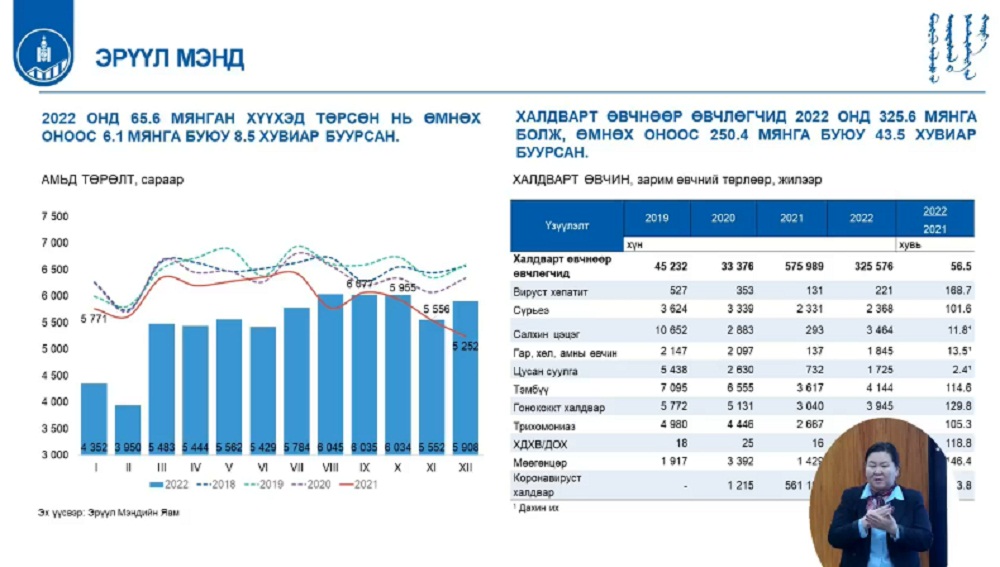 Энэ үеэр Эрүүл мэндийн салбарын тоон статистикийг мөн танилцуулсан юм. Тодруулбал, 2022 онд Монгол Улсад 65.6 мянган хүүхэд төрсөн бөгөөд энэ нь өмнөх оны мөн үетэй харьцуулахад 6.1 мянга буюу 8.5 хувиар буурсан үзүүлэлт болсон байна.