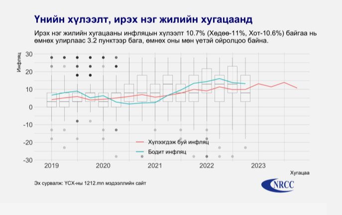 Ирэх 6 сарын хугацаанд үнийн түвшин өснө гэсэн хүлээлттэй иргэдийн хувь 70, ирэх нэг жилийн хугацаанд үнийн түвшин өснө гэсэн хүлээлттэй иргэдийн хувь 58 байна. Хэрэглэгчид инфляцын түвшинг ирэх 6 сар болон нэг жилийн хугацаанд харгалзан 9.5 болон 10.7 хувь байна гэсэн хүлээлттэй байна. Хүлээгдэж буй инфляцын ойрын 6 сар болон жилийн дараах түвшингүүд өмнөх улиралтай харьцуулахад буурсан байна.