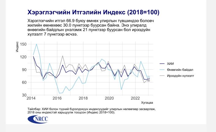 Эдийн засгийн ерөнхий байдал болон хэрэглэгчид өөрсдийн санхүүгийн байдлын талаар хэр зэрэг өөдрөг бодолтой байгааг хэмждэг "Хэрэглэгчийн итгэлийн индекс" судалгааны шинэ мэдээллээс хүргэе. "NRCC” болон Монгол-Японы хүний нөөцийн хөгжлийн төвөөс Хэрэглэгчийн итгэлийн улирал тутмын судалгааг өнгөрсөн арванхоёрдугаар сард зохион байгуулжээ.