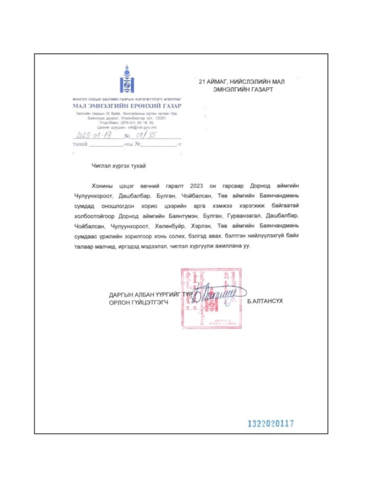 Үүнтэй холбоотойгоор нэгдүгээр сарын 19-ний өдөр Мал эмнэлгийн ерөнхий газраас 21 аймгийн Мал эмнэлгийн газарт чиглэл өгсөн байна. Тухайлбал, Мал эмнэлгийн ерөнхий газраас аймгуудын холбогдох албаныханд хонины цэцэг өвчин бүртгэгдсэн бүс нутаг болоод түүнтэй ойр Дорнод аймгийн Баянтүмэн, Булган, Гурванзагал, Дашбалбар, Чойбалсан, Чулуунхороот, Хөлөнбуйр, Хэрлэн сум, Төв аймгийн Баянчандмань сумаас үржлийн зорилгоор хонь солих, бэлгэнд авах, бэлтгэн нийлүүлэхгүй байх чиглэлийг иргэдэд өгөхийг даалгажээ.