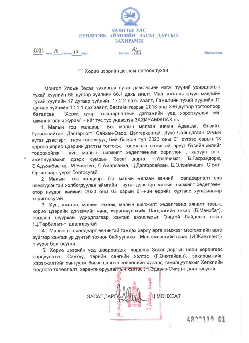 Малын гоц халдварт мялзан өвчний голомт Дундговь аймгийн Адаацаг, Өлзийт, Гурвансайхан, Дэлгэрцогт, Сайхан-Овоо, Дэлгэрхангай, Луус, Сайнцагаан сумын нутгуудад үүсээд байна. Үүнтэй холбоотойгоор аймгийн Засаг дарга "Хорио цээрийн дэглэм тогтоох тухай" А29 дүгээр тогтоол гаргажээ.